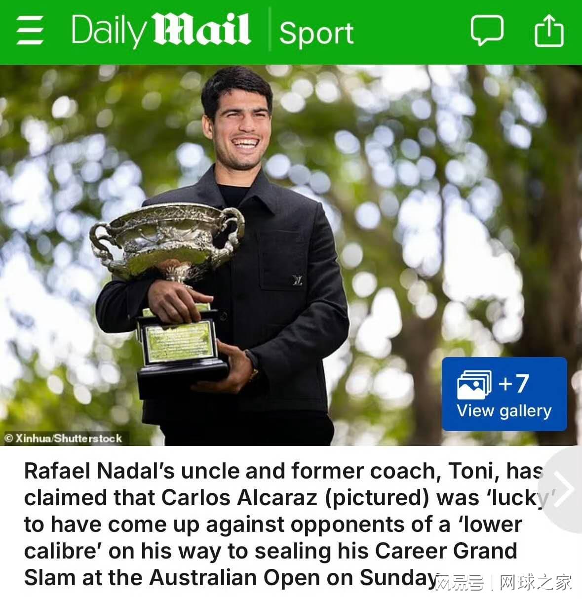 这位培养出一代天王的功勋教练,在肯定阿尔卡拉斯拥有“出色的身体条件”和“卓越的技术”后,话锋一转,对这位新科澳网冠军的夺冠之路给出了令人意外的评价:在他看来,阿尔卡拉斯之所以能夺冠很大一部分归功于他的运气不错,托尼叔叔表示,“他的对手整体水平都不如他,并且决赛很幸运遇见比他水平低很多的选手。”